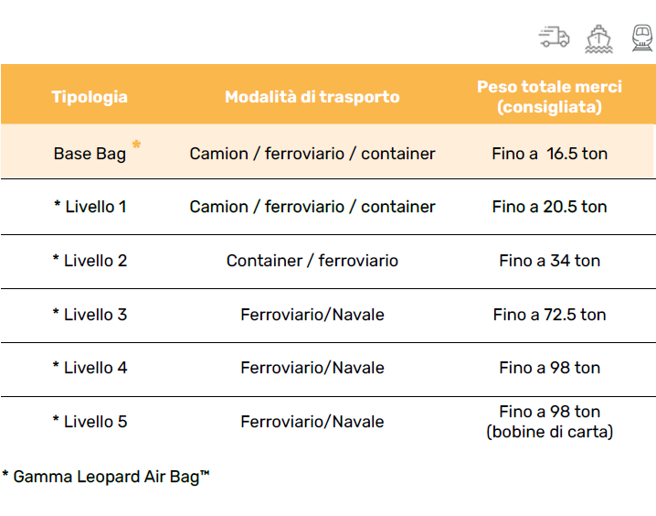 Originally developed for non-heavy duty use, today they can be used as a space filler inside wooden crates, for shipping furniture, machinery and components in general. They complete the range of A.A.R certified air bags in the Leopard Air BAG range: